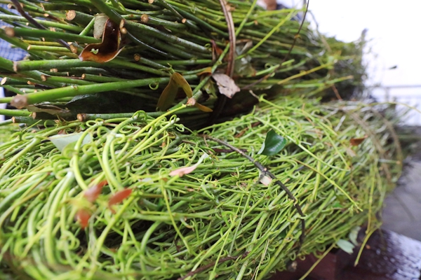 在翁王村的臨時收購點一派繁忙,一捆捆色澤青綠、形態(tài)飽滿的鉤藤堆積如山。工作人員按標準逐批質(zhì)檢、稱重、登記,現(xiàn)場秩序井然。“以前采收后還得四處找銷路,現(xiàn)在在家門口就能賣,現(xiàn)場就能結款,根本不愁賣不出去!”剛賣完鉤藤的散戶張劍鋒拿著結算單,臉上滿是笑容。