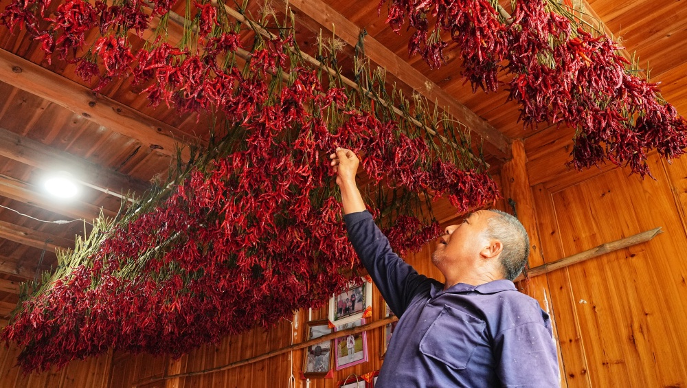 趁著晴好天氣,不少村民將自家的辣椒搬到石板地上鋪開,動作嫻熟又認真地將辣椒擺得均勻,確保每一顆都能被陽光充分照耀,好更快曬干收存。農戶李大哥家的二樓屋頂,更是掛滿了一串串火紅的辣椒,像極了垂落的喜慶瓔珞。這滿室的紅,不僅是餐桌上的食材,更是一家人一年辛勤勞作的見證。
