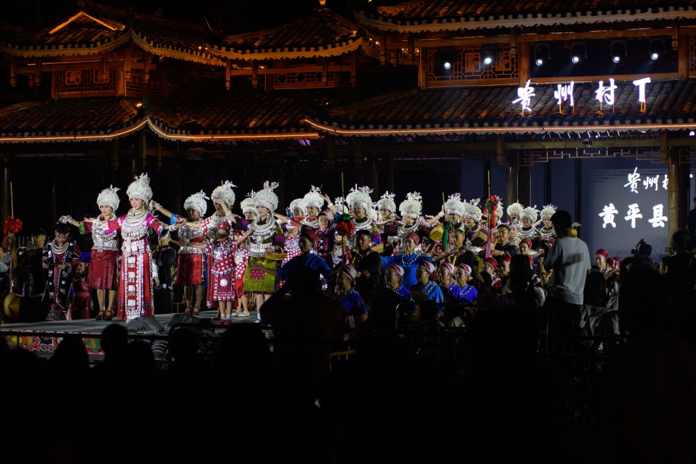演出在黃平苗歌傳承協會的《苗族大歌》中啟幕,多聲部合唱如天籟般縈繞會場,古樸悠遠的旋律瞬間將觀眾帶入苗鄉秘境。黃平縣文化館演繹的《板凳舞跳起來》隨即點燃全場熱情,表演者手持板凳踏節而舞,清脆的敲擊聲與歡快舞步交織,展現苗族同胞豪邁奔放的性格特質。丹阿組合獻唱的《帶你去貴州》用旋律勾勒黔中山水,藍天團隊《我在黃平等你來》則以質樸歌聲向四方賓朋發出真摯邀約。