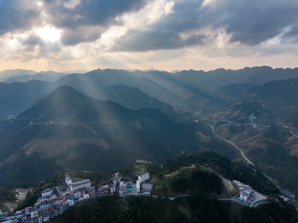 12月10日,在貴州省從江縣加勉鄉拍攝的“丁達爾”現象(無人機照片)。